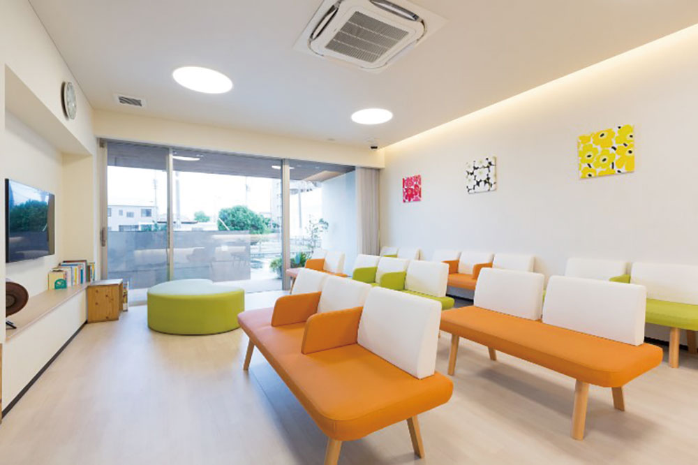 一面ガラス張りで外光を採り入れた明るい待合スペース。