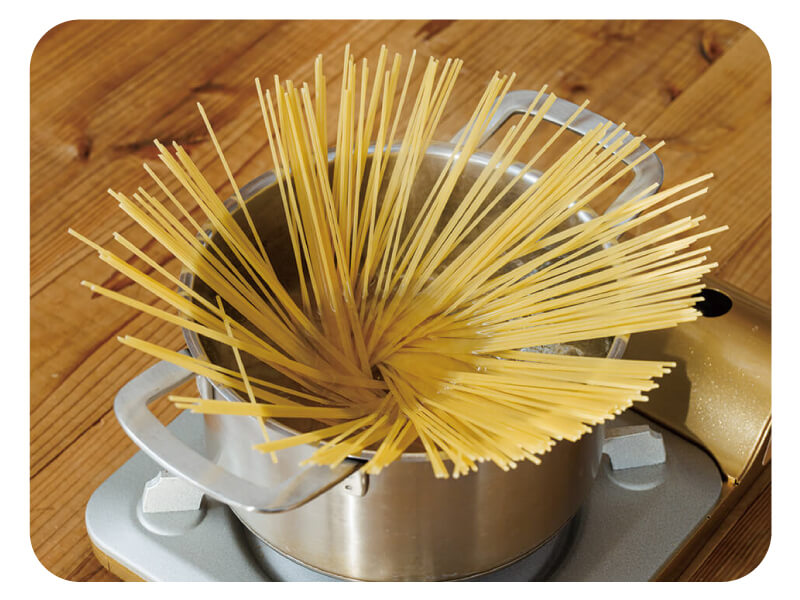 (3)鍋にお湯を沸かし、塩を加え、パスタをパッケージ表記時間よりも1分少なくゆでる。