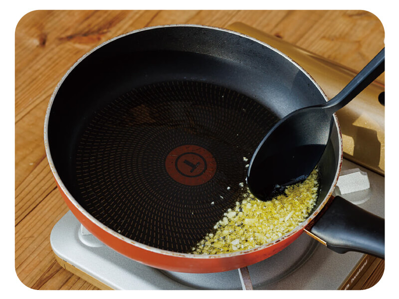 (4)フライパンにオリーブオイル・(2)のニンニクを入れて弱火にかける。