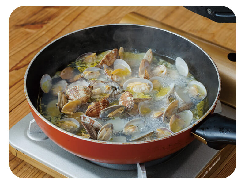 (5)ニンニクの香りがしたら、アサリ・パスタの茹で汁200cc・酒を加えて火にかける。沸騰したら蓋をして中弱火にし、2〜3分煮る。