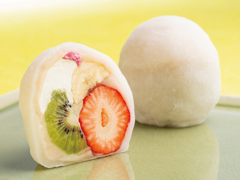 丸ごとの苺に相性の良いキウイとバナナ、そして風味豊かなクリームチーズと塩漬け桜花一輪。5つの素材を特製白で包み、大きな大福餅に仕上げています。