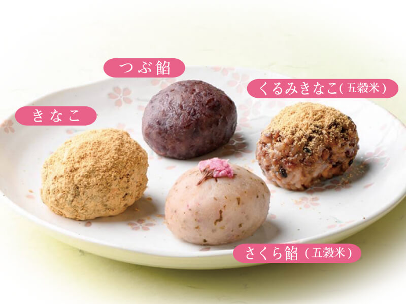 桜葉と花びらの香る「さくら餡」で五穀米のおはぎを包み、上に塩漬け桜花を乗せています。
