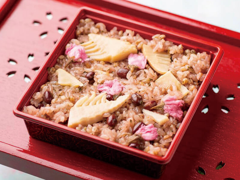 桜の香り漂う「桜おこわ」は、普通寺産ダイシモチと、大粒小豆、味付け筍、塩漬け桜花と桜葉を入れ、春の香りが堪能できます。健康志向のダインモチの粒々食感も新鮮です。朝一番の温かいおこわと、瞬間冷凍のおこわもご準備。