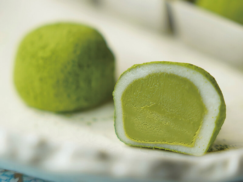 ミルキーなホワイトチョコに純生クリームと特上宇治抹茶を練り込んだ「抹茶ガナッシュ」を、程よい柔らかさで伸びのあるお餅で包み、まわりにも宇治抹茶をまぶしています。