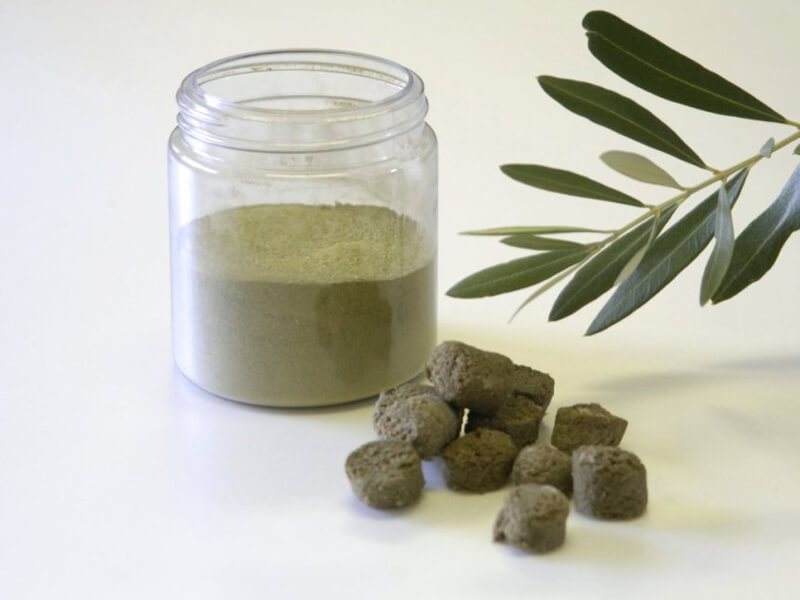 ▲オリーブハマチ、オリーブぶりのエサに混ぜるオリーブ葉粉末とオリーブ添加MP。