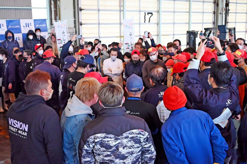 ▲ブランド認定1号の「煌」のセリは、仲買人の周りを多くのギャラリーが囲み、まるでファンに取り囲まれたアイドルのよう。