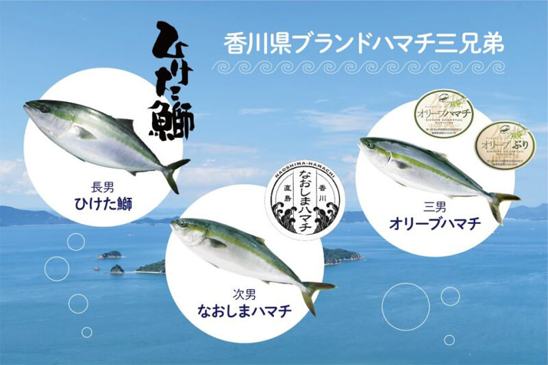ハマチは平成7年(1995年)に県魚として指定され、平成20年(2008年)に香川県のハマチ養殖80周年を迎えたことを記念して「香川ブランドハマチ三兄弟」が誕生しました。大きな生簀でのびのびと大らかに育った長男「ひけた鰤」、潮の流れの速い海で元気に育った次男「なおしまハマチ」、県魚のハマチと県木県花のオリーブのコラボーレーションによって生まれた三男「オリーブハマチ」。ハマチ養殖発祥の地ならではの、歴史が築き上げ、個性があふれる「ハマチ三兄弟」は、県民に広く愛されています。
