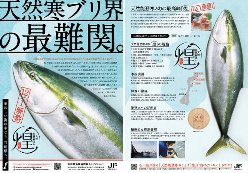 「天然能登寒ぶり」のトップブランドとして、今冬から「煌(きらめき)」がデビューしました。2022年12月1日から翌1月31日までの期間、「天然能登寒ぶり」のうち所定基準をすべて満たすものだけが、市場の目利き人により「煌」に認定されます。