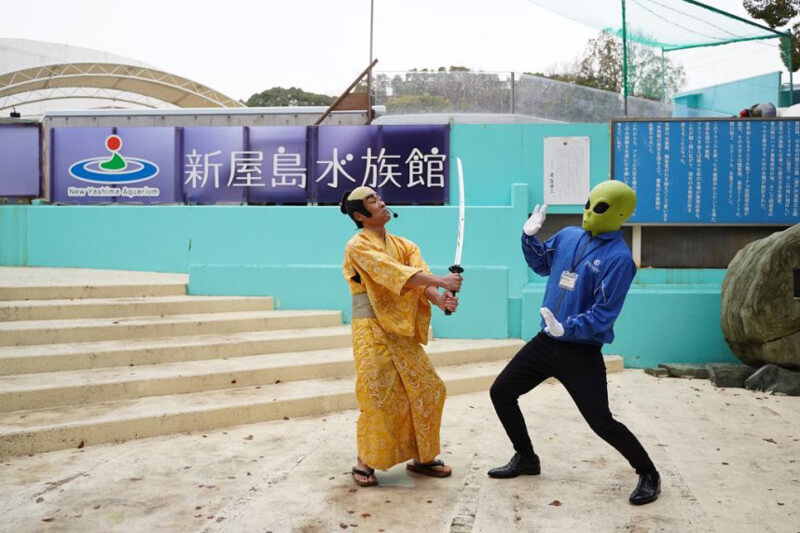 ▲「新屋島水族館」を訪れたサンダーくんにいきなり斬りかかる世直し侍。