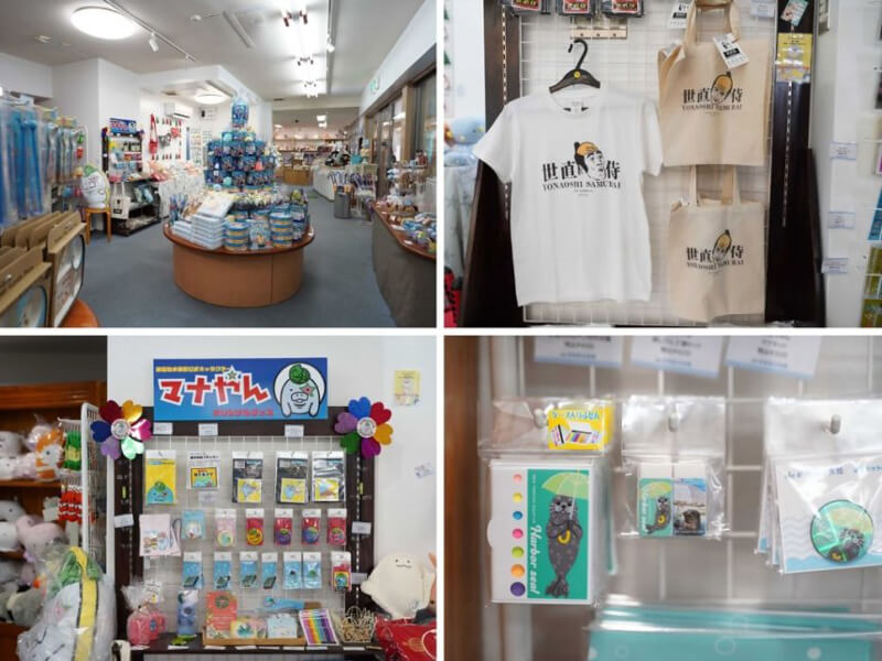 館内をまわって生き物との触れ合いを存分に堪能したら、最後はグッズ売り場へ!世直し侍をはじめ、「新屋島水族館」公式キャラクター「マナやん」のオリジナルグッズなど、旅の思い出になるアイテムが多数揃っています!
