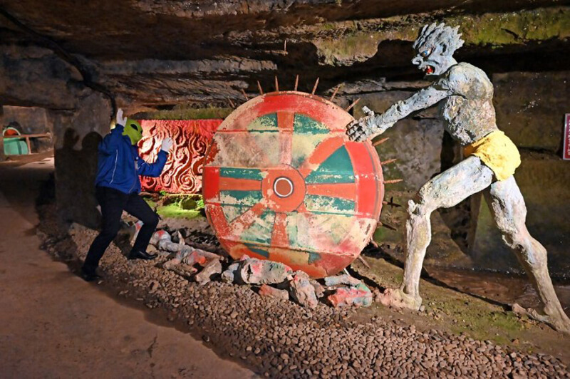 ▲かつて石切り場だった洞窟の中に、仏像やインドの神像、勧進帳の弁慶像などさまざまな作品が展示され、独特の世界が醸し出されている。