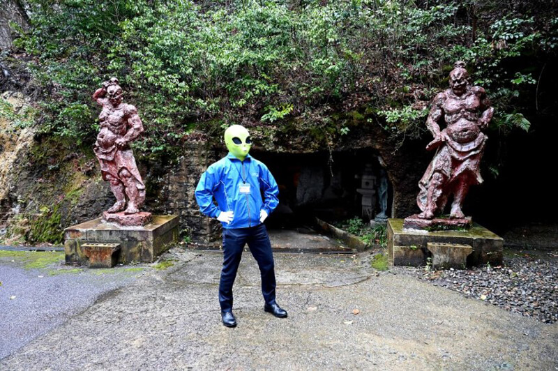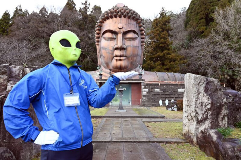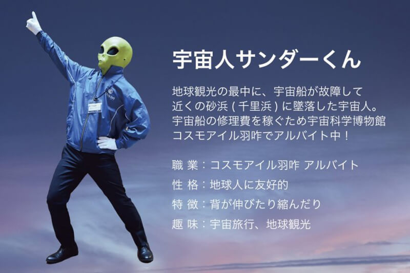 ▲石川県の「コスモアイル羽咋」で働く宇宙人のサンダーくん。壊れた宇宙船の修理費用を稼ぐために「コスモアイル羽咋」でアルバイト中。