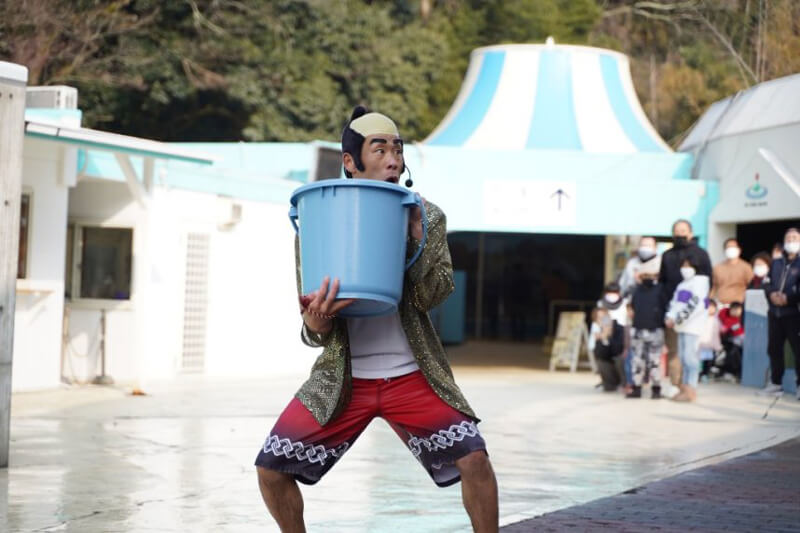週末に訪れる人々が楽しみにしているのが、世直し侍が登場する「イルカ劇ライブ」。登場するや否や飼育員のお姉さんに斬りかかり、「安心せい!みねうちじゃ?!」と言いながらステージをジャック。その後、イルカと息の合ったパフォーマンスを披露しながら、分かりやすくその生態を教えてくれます。ライブの途中には、”暗い理不尽な世の中を笑顔にするためにやって来たでござる”と言いながら、かっこいいラップも披露!約30分のライブ中、大人も子どももノリノリに!