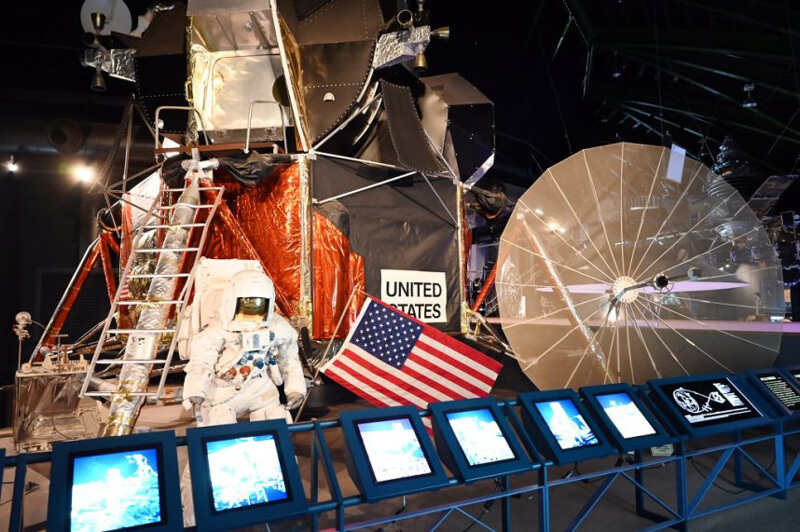 ▲アポロ17号をモデルに組み上げられた、月面着陸船の実物大模型。本物は月面に残してきている。表面の赤・金・銀のシートは本物と同じ素材で、太陽光線を遮って宇宙船内の温度を一定に保つことができる。