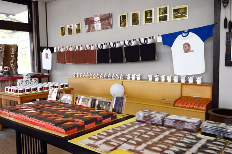 駐車場横の売店では、ハニベ大仏のTシャツ、ハニベ地獄めぐりの写真集(ポストカード)、手ぬぐい、マグカップのほか、福助や干支の置物などのハニベ焼きも販売。「ハニベ大仏がプリントされたTシャツと手ぬぐい、ボクの母星でも流行りそうです」とサンダーくんもお土産に購入です。