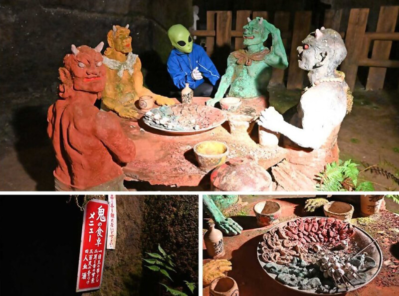 「都賀田勇馬さんは、明治24年生まれ、東京美術学校(現・東京藝術大学)で学び、帝展や日展などでも活躍した石川県を代表する作家デス。ここで地獄巡りや独特の世界観を体験し、ユニークな映え写真もたくさん撮影できるのは、芸術家が創り上げた超リアルで本気の作品があってこそデス」とサンダーくん。