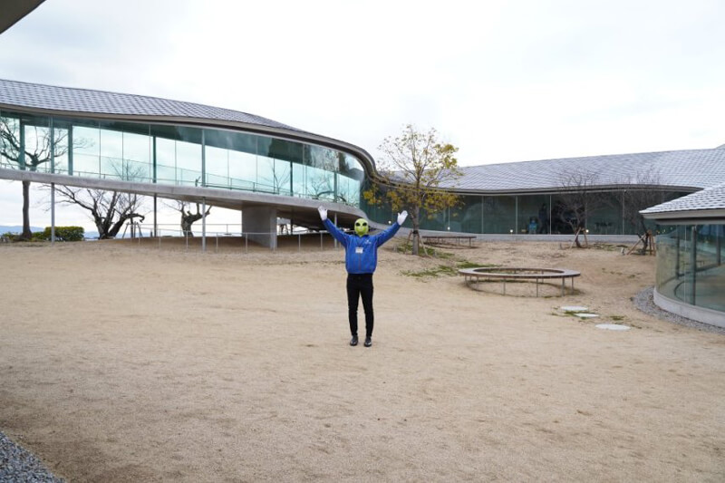 世直し侍と別れてサンダーくんが向かったのは、2022年8月にオープンした屋島山上交流拠点施設「やしまーる」。こちらは、屋島やその周辺地域の自然や歴史、文化などの魅力を広く発信し、様々な交流や学習の機会、憩いとふれあいの場を提供している施設です。なんといっても特徴的なのが建物の構造。約200メートルの回廊型の建物は、周辺の自然環境に溶け込むように設計されており、地形の起伏と呼応するように中庭が造形され、建物自体は細く長く、地形の間を流れる川のように一周しています。山側は屋島の自然を、海側は瀬戸内海の絶景を眺めることもできます。