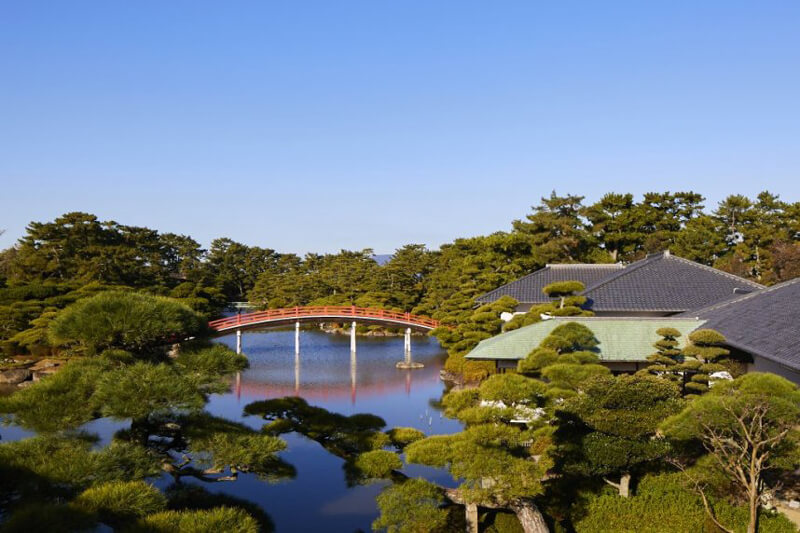 うちわ工房「竹」と同様にうちわ作り体験ができる「うちわの港ミュージアム」が、2023年4月に大名庭園としても有名な中津万象園内に「丸亀うちわミュージアム」として移転オープン。中津万象園は、1688年に京極藩藩主により築庭され、琵琶湖を模した大きな池に近江八景をなぞらえた八つの島を配し、その島々を橋で結んだ池泉回遊式の大名庭園です。また、園内にはフランス絵画を展示する「丸亀美術館」も併設されています。うちわ作りの後には庭園の散策で素晴らしい景色を楽しんでみては。