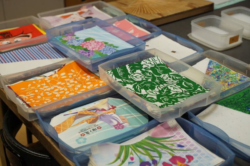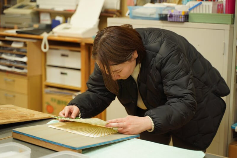▲骨ができた後は貼りの作業。豊富なデザインからお気に入りの1枚を選ぶ。