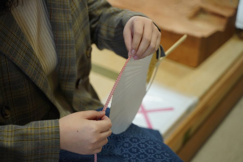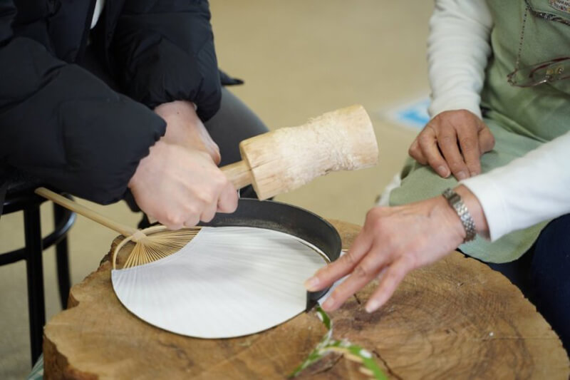 うちわ工房「竹」ではなんと、制作体験(骨制作、貼り、たたき)をすることができます!こちらには6名の丸亀うちわ職人が在籍しており、先ほどお話を伺った三谷さんにうちわづくりを教えていただきました!