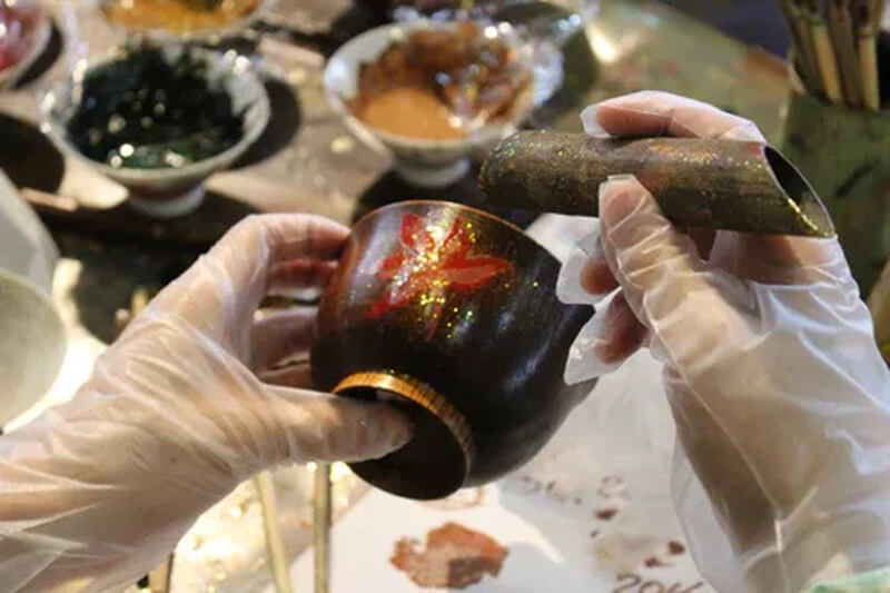 ▲【漆絵付け体験】漆が固まる前に金粉や銀粉を蒔いて仕上げる。
