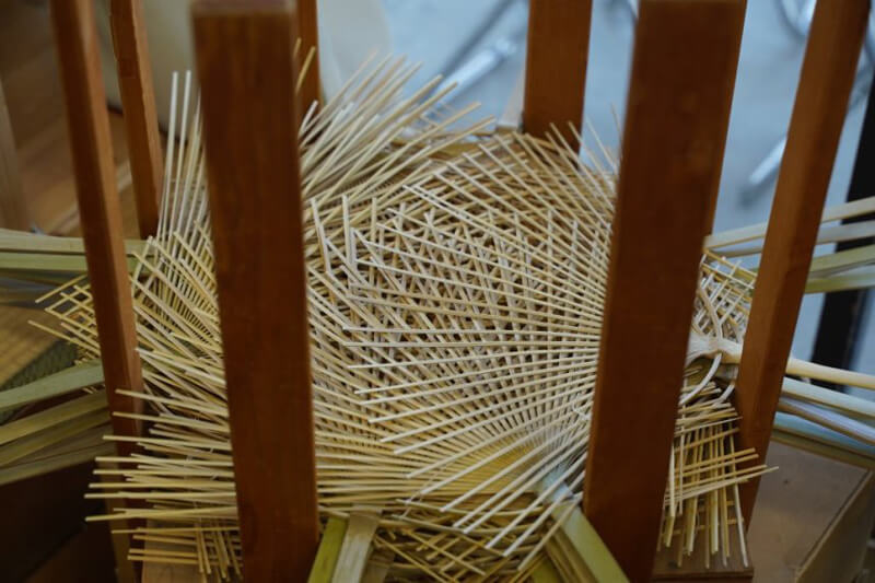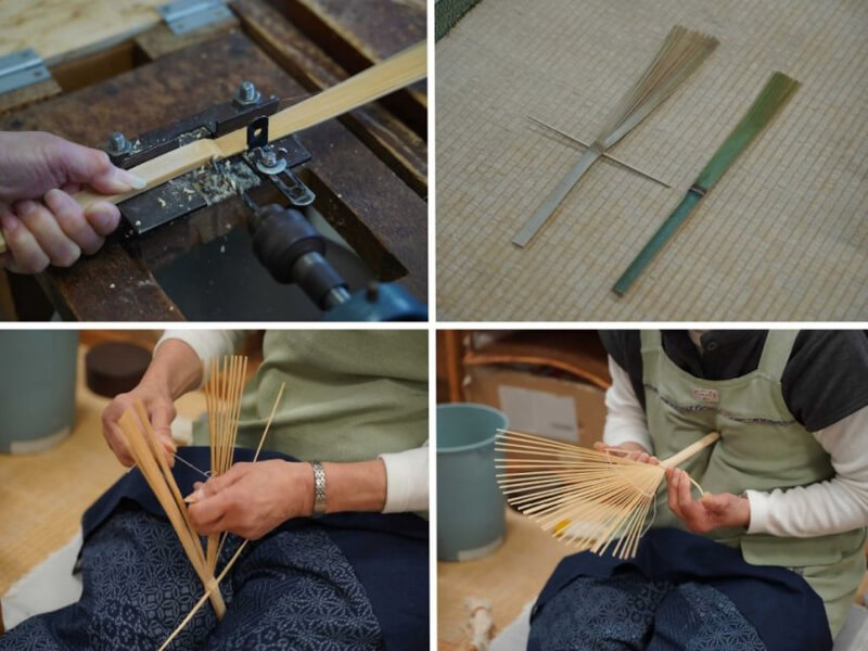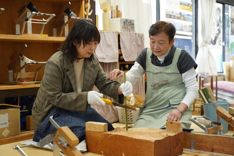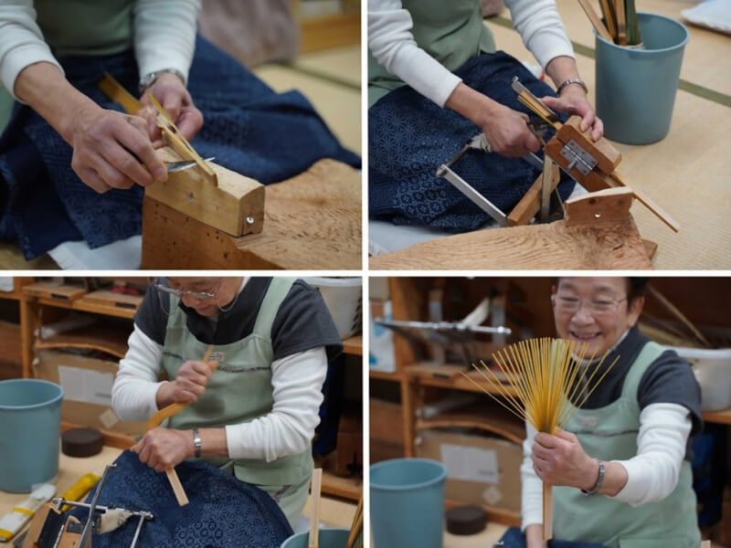 丸亀うちわは、竹によって仕上がりに違いが生まれるので、うちわづくりに適した竹を選ぶことが大切(丸亀うちわは「男竹」を使用)です。三谷さん曰く、良い竹を見極めるには「節」を見るのがポイントなのだとか。さらに、竹を加工する骨の工程は出来栄えを左右する重要な工程で、専用の器具を使い職人の技で丁寧に作っていきます。初めて体験する場合でも職人が丁寧に教えてくれるので安心。