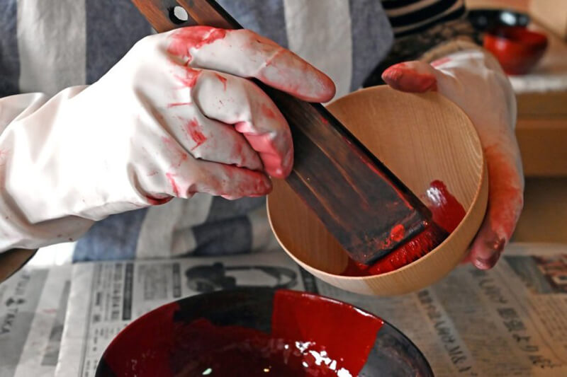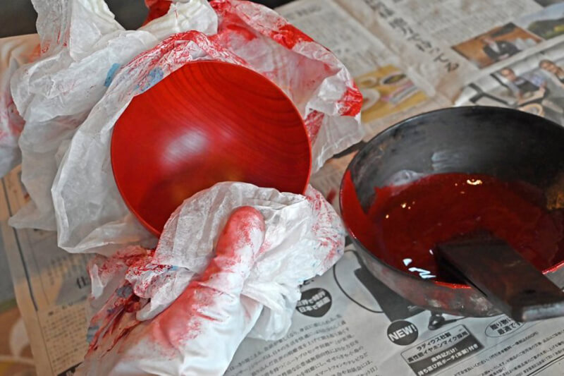 ▲【拭き漆体験】ベースの木地が決まったら、色は伝統的な赤、黒、茶色から1色を選び、ハケを使って全体にムラなく塗る。