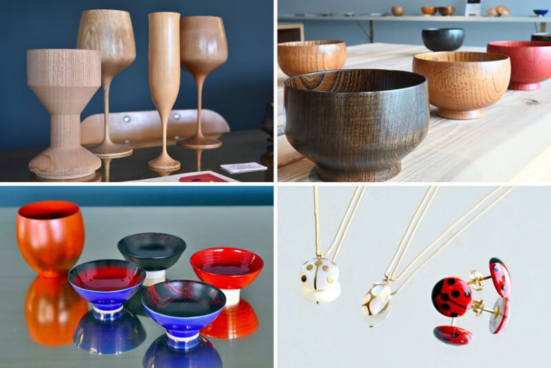 店内では国産の木にこだわった漆器類が展示・販売され、木のぬくもりが伝わってくる木目を活かした拭き漆の器や、伝統を受け継ぎながらも独自に開発した淡いピンクやブルーの漆器など、カジュアルな品が多いのが特徴。このお店の2階がワークショップのスペースで、プロの職人さんの手ほどきを受けながら、漆絵付けと拭き漆の漆器づくりが体験できます。