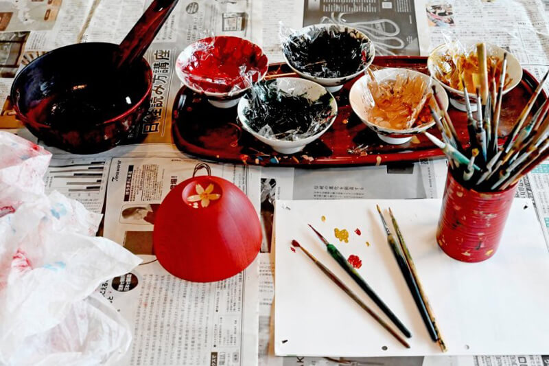 ▲塗師(ぬし)の工房では、漆塗り専用のハケや筆、漆を乾かす特別な設備など、珍しい道具がいっぱい。繊細な手仕事を間近で見ることができる。