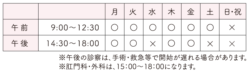 ・肛門外科 ・肛門内科 ・外科 ・整形外科 ・消化器外科 ・消化器内科