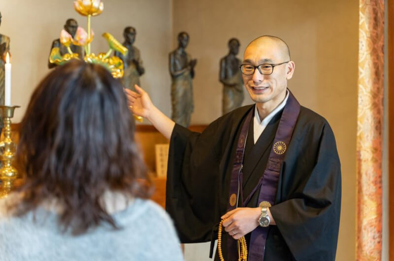 ▲『総本山善通寺』を案内してくれた住職の中嶋さん。後ろにある建物は「御影堂(みえどう)」といって、奥殿の厨子内には秘仏「瞬目大師像(めひきだいしぞう)」が祀られている。