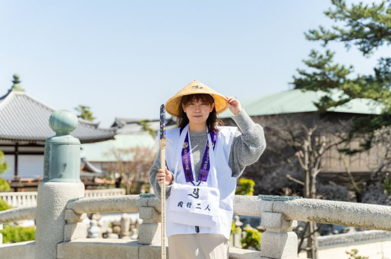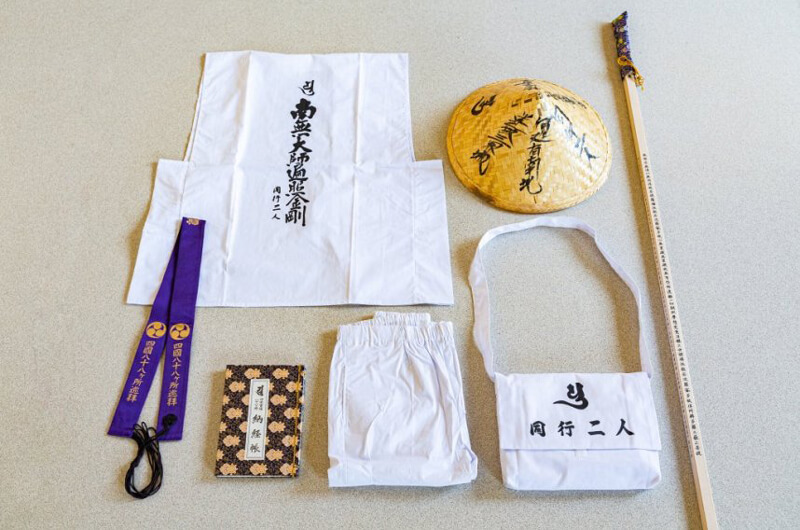 ▲お遍路の服装。菅笠(すげがさ)、白衣(びゃくえ)、金剛杖(こんごうづえ)は基本の3点セット!