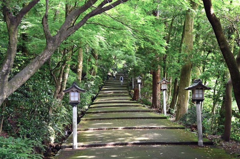 ▲参道の階段を囲む樹々の深いグリーン、沿道を流れる小川のせせらぎや滝の音も聞こえてきて、凛とした清浄な空気に身心が清められる。