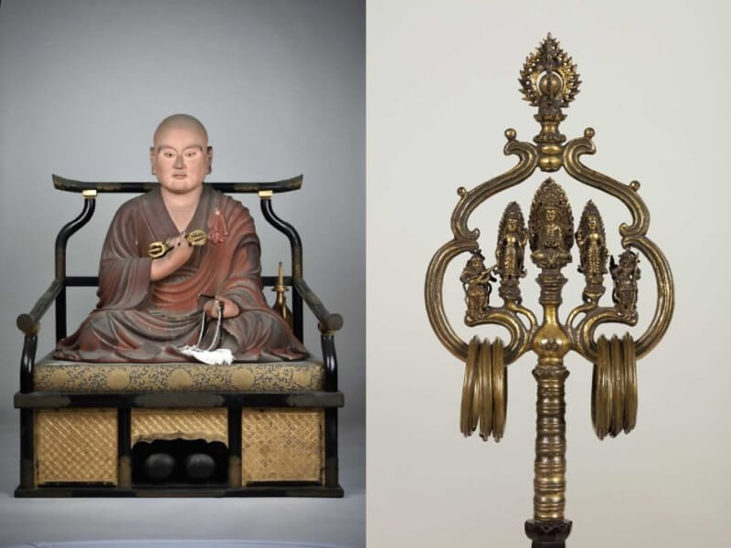 ▲(写真左)弘法大師坐像 威徳院蔵、(写真右)国宝 金銅錫杖頭 善通寺蔵 後期展示(2023年5月9日~5月21日)。空海生誕の地、総本山善通寺の至高の御宝物、党から持ち帰ったと伝わる密教法具。