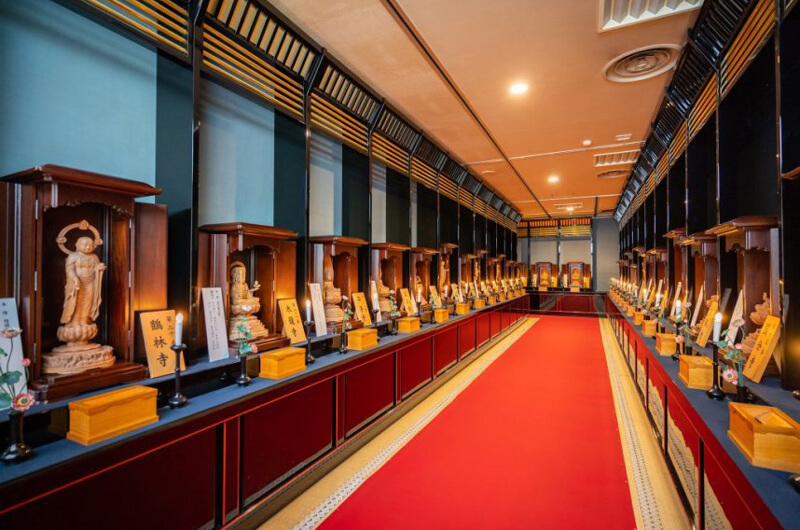 足元にある赤いカーペットの下には各札所の「お砂」が敷かれているので、この上を踏みながら順番にお参りします。音のない空間は神聖な空気が漂い、1ヶ寺ずつお参りすると煩悩が消え、心が落ち着きます。お遍路の”きっかけ”として、ぜひ体験してみてください。