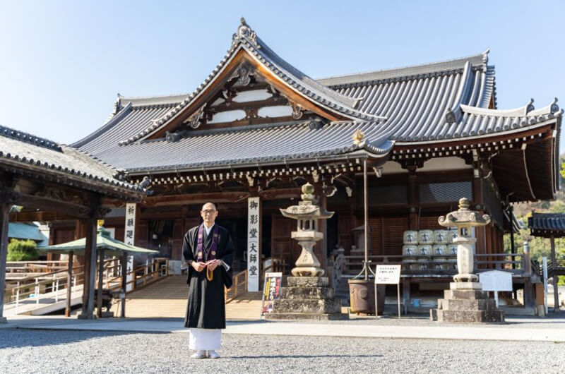 ▲『総本山善通寺』を案内してくれた住職の中嶋さん。後ろにある建物は「御影堂(みえどう)」といって、奥殿の厨子内には秘仏「瞬目大師像(めひきだいしぞう)」が祀られている。