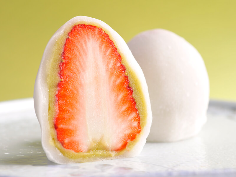 香りが自慢の香川県産煎茶で作る煎茶餡と大粒いちごの相性は抜群で、想像を超えた味わいです。新鮮ないちごの味の後から広がる煎茶の香りをお楽しみください。