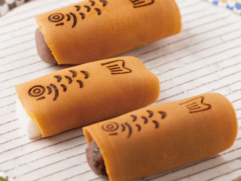 しっとりとした焼き皮で それぞれ、しっとりした「粒あん(黒鯉)」、さぬきひめの「いちご餡(緋鯉)」、爽やかな高知産柚子入りの「ゆず餅(青鯉)」を巻いています。 こいのぼりの焼き印は、この季節にぴったりです。