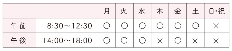 木曜、日曜、祝日 ※土曜の診療は17:00まで
