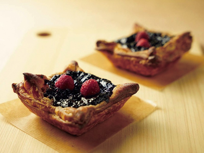 バターの香り漂うパイの上にカステラ生地を置き、その上に「マルベリー」と「ラズベリー」の特製ジャムをのせて焼き上げました。2つのベリーを合わせた特製の自家製ジャムは、ベリーの酸味や香りも良く、パイとの相性はバッチリ! 仕上げに生のラズベリーを2個乗せて、さらに味わいを増しています♪。