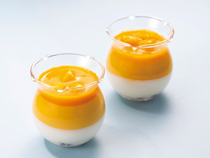 やわらかな杏仁プリンの中には「丹波大納言の鹿の子豆」を入れて、上には 濃厚でトロピカルなマンゴーのプリンを合わせて。さらに マンゴーの果肉ピューレを乗せた、贅沢な夏のデザート。