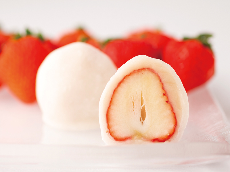 これまでの夏いちごとは違い、大粒で甘みが強く、みずみずしい食感で、香りも良く、美味しさ際立つ、北海道生まれの「夏瑞いちご」の大福。