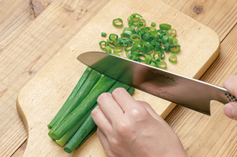 (2)青ネギを小口切りにする。