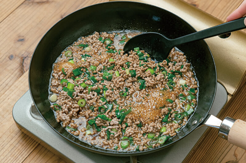 (3)フライパンに油(分量外)を加え、豚ひき肉を色が変わるまで炒めたら、青ネギ・濃口醬油・みりん・砂糖を加えて煮詰める。