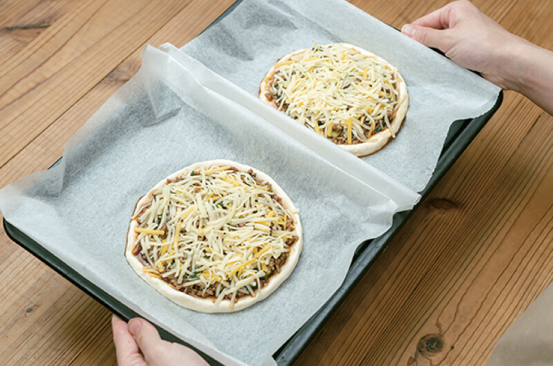 (5)(4)に、(3)の甘辛ひき肉、チーズをのせ、220℃に予熱したオーブンで約10分焼く。