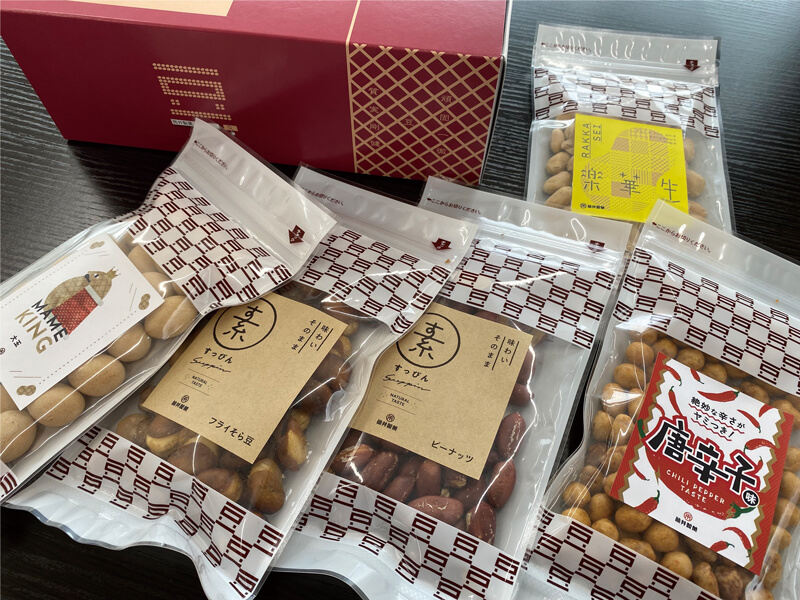 手土産に、お父さんの晩酌のお共に。 お好みの豆菓子を専用ギフトボックスでどうぞ。