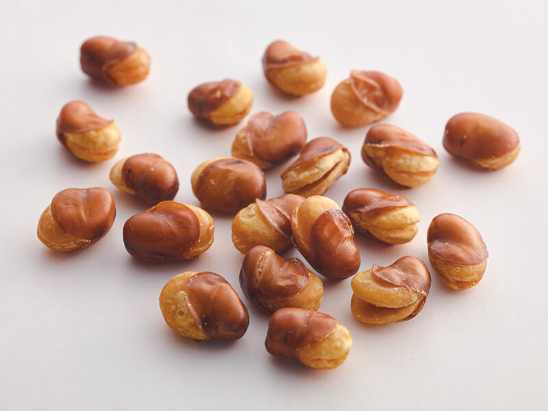 独自開発の専用機械で1粒1粒に切れ目をいれてあるため、皮がつるりと剥けるひと工夫も心憎い。豆を指でつまんで、切れ目のある方の先端を前歯で少し噛んで皮から引き出します。
