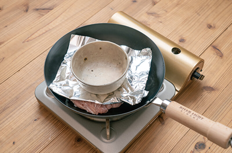 (2)フライパンに鶏もも肉の皮面を下にし、重しとしてお皿などをのせ、弱火で約12分焼く。