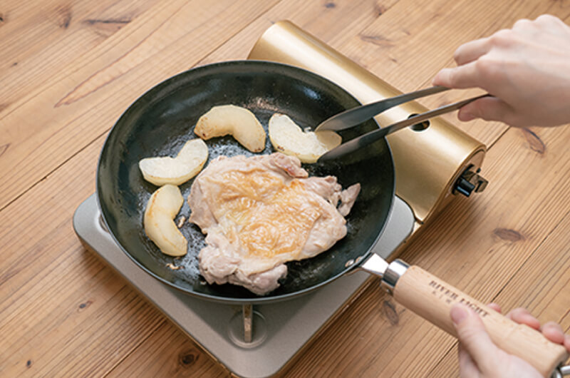 (3)皮に焼き色が付いたら裏返し、ナシ(ソテー用)を加えて中火で焼き、焼き色がついたら取り出す。
