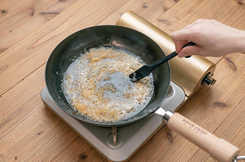 (4)フライパンの油をふき取り、【A】を入れて沸騰させる。